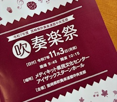 11月3日は、アイザックスターンホールで「吹奏楽祭」。全県ではなく、県吹奏楽連盟中央支部の催しでしたが、宮崎市を中心に、小、中、高、中高合同、市民の吹奏楽団など、27団体が参加。