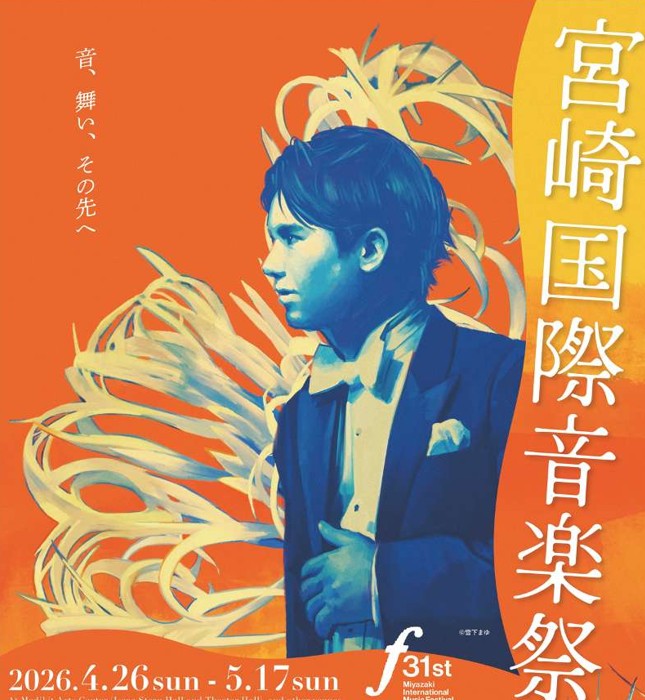 今年の第31回宮崎国際音楽祭のメインビジュアル。遠くを見つめる音楽監督の背景には宮崎県の花「ハマユウ」が咲き乱れています。