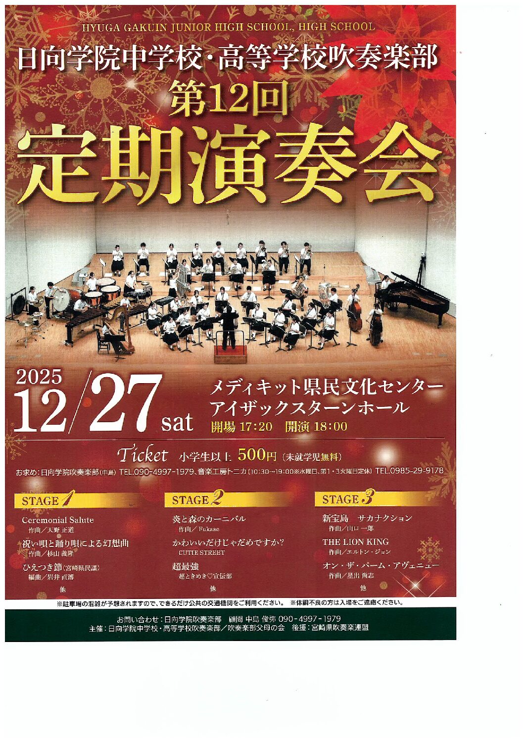 音楽 宮崎日本大学中学校・高等学校吹奏楽部「第11回定期演奏会」 2025年12月20日(土) アイザック スターンホール 開場 13:00/開演 13:30/終演予定 15:30 駐車場の混雑が予想されます 詳しく見る