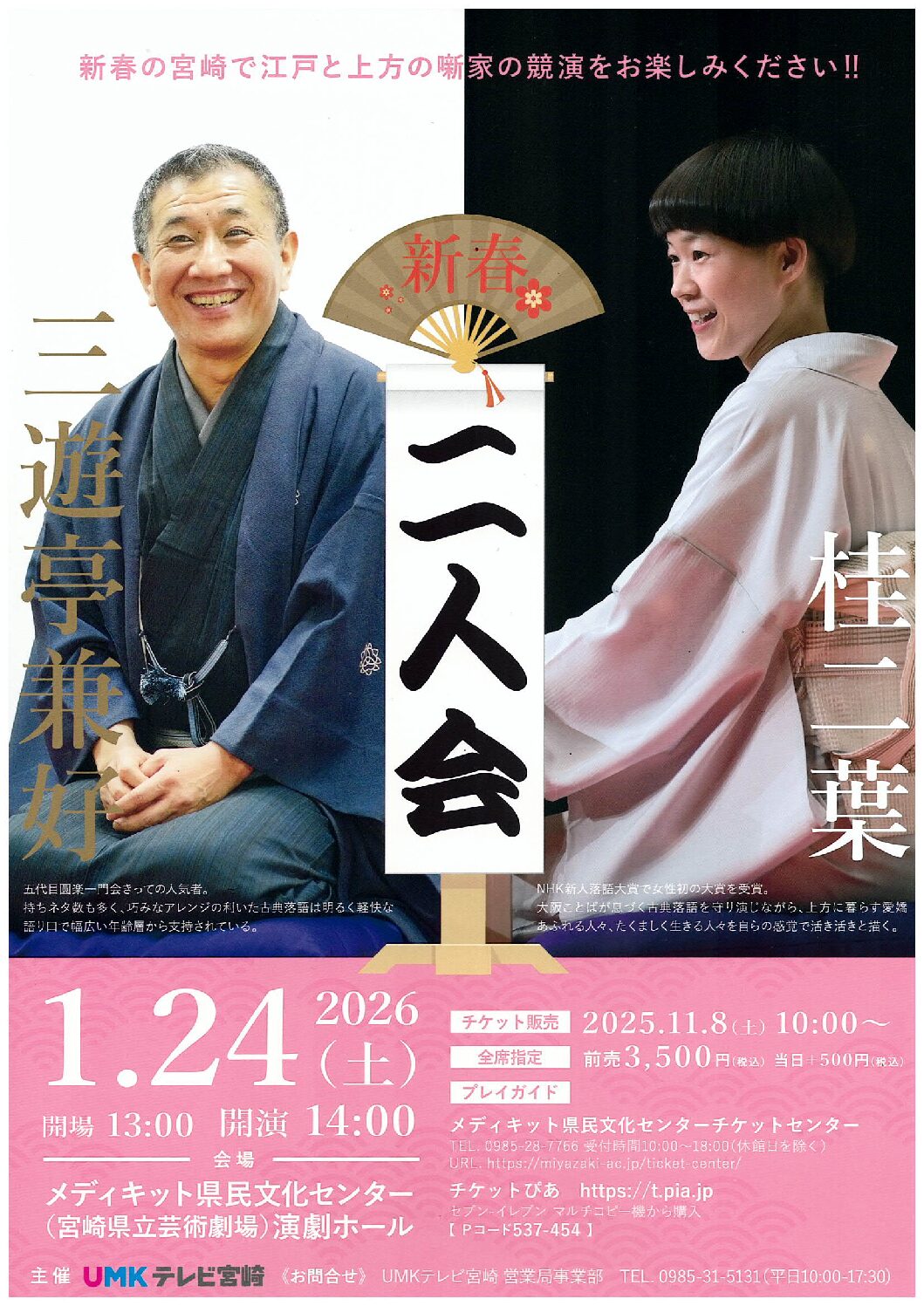 その他 宮崎漫才選集 2025年11月09日(日) 演劇ホール ①開場12:15/開演13:00/終演予定15:00 ②開場15:45/開演16:30/終演予定18:30 駐車場の混雑が予想されます 詳しく見る