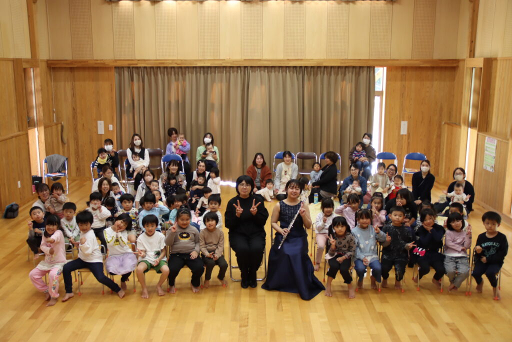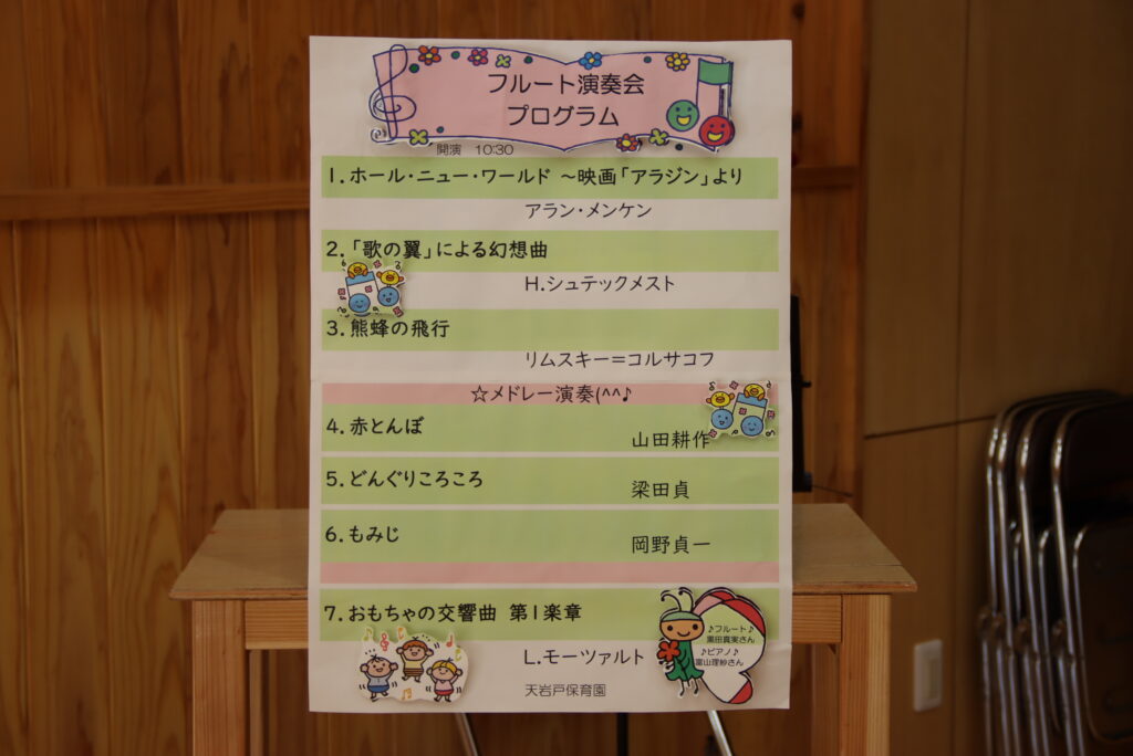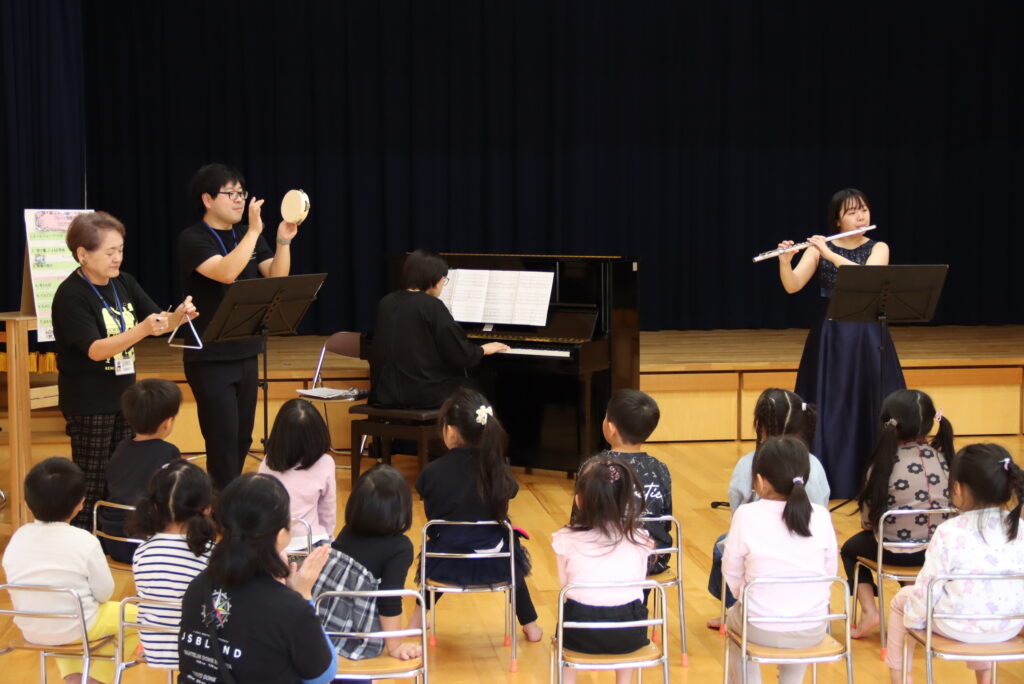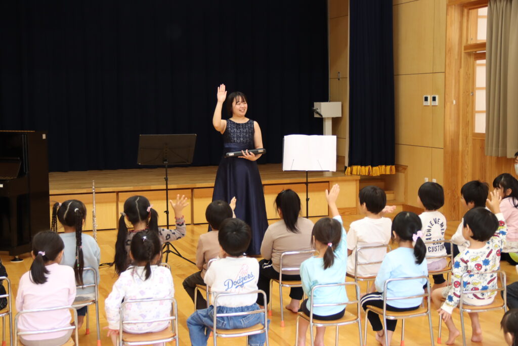 ディズニー映画「アラジン」より「ホールニューワールド」で始まり、初めてフルートを目にする園児たちが真剣に見つめて聴いてくれているのが嬉しかったです。2曲目にシュテックメスト作曲の「歌の翼による幻想曲」を演奏し、楽器紹介をしました。演奏の時はすごく静かに聴いてくれて、対話をする時はちゃんと応えてくれてとても良い空気感でコミュニケーションもできました。その後リムスキー=コルサコフ作曲の「熊蜂の飛行」を演奏しました。