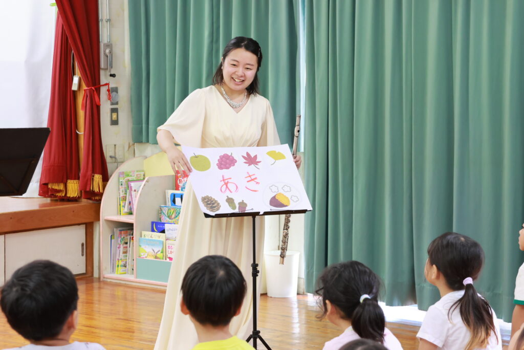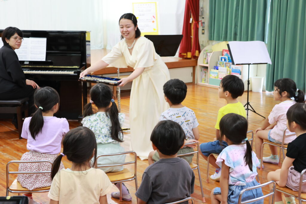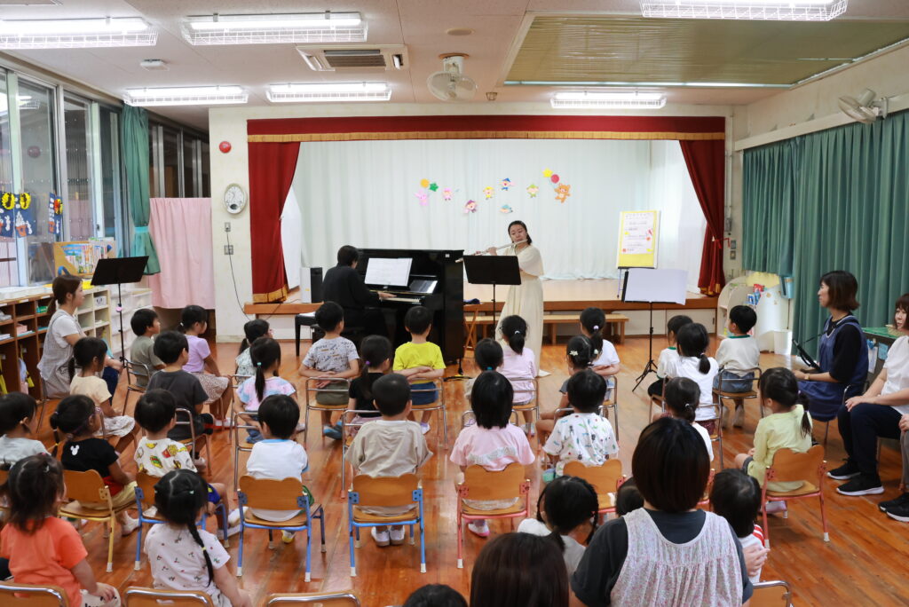 はじめにディズニー映画「アラジン」より「ホールニューワールド」を演奏しました。初めてフルートを目にする園児たちも多く、集中して聴いている子どもたちの表情が印象的でした。2曲目にフルートの優しい音色がよく伝わる、シュテックメスト作曲の「歌の翼による幻想曲」を演奏し、楽器紹介をしました。音が鳴る仕組みをビンを使って説明し、園児1名にやってもらったところ、見事音が鳴って盛り上がり、コンサートの空気が柔らかくなったのを感じました。その後リムスキー=コルサコフ作曲の「熊蜂の飛行」を演奏し、これまでの2曲とは異なる曲調に園児たちは驚き、とても好評でした。
